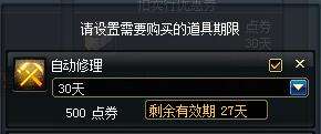 2、免费修理(购买方式 商城-道具-优惠-魔王之契约):搬砖对于装备的损耗是很大的,而且高级装备的维修费用是相当高的,所以花费500点券(代币券)一个月的免费修理必须有。