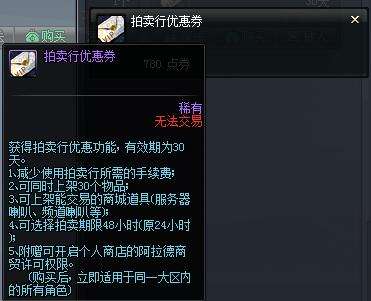 4、拍卖行优惠券:价格780点券一个月,这个不是搬砖必备的,但是商人必备,功能室拍卖行手续费从5%降低到3%,并且可以使用28小时拍卖行,对于大量出售材料的玩家可以考虑,普通格蓝迪搬砖党不需要购买。